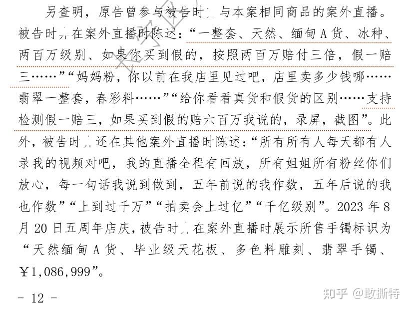 案件当事人 原告“李某” 邓某原文出处:知乎上海高院专栏 审理互联网案件的4种思维 《审理互联网案件的4种思维》 ![]() 2023年8月1日案件在宁波起诉立案,后因拼多多代理人提出管辖异议,案件移送到上海,上海市长宁区法院(2023)沪0105民初34997号案件卷宗材料显示: ![]() 当时在宁波起诉的诉求是:“判决被告继续履行此次买卖合同的赔偿部分,向原告赔偿合同承诺的假货赔偿金1800万元”。 其理由如长宁法院(2023)沪0105民初34997号《判决书》所述: 《判决书》第12页,另查明被告直播间陈述“一整套……两百万级别、如果你买到假的,按照两百万赔付三倍,假一赔三……支持检测假一赔三,如果买到假的赔六百万。我说的,录屏,截图”。 ![]() 二、网文审判长邓鑫观点解析:忽略核心词 六百万,误导公众 邓某在网文中这样表述:“高货,全冰种,达到两百万级别”的翡翠,并承诺“假一赔三”。 【解析】此处邓某故意省略“按照两百万赔付三倍,假一赔三……假一赔三,如果买到假的赔六百万” 此“假一赔三”非我们通常理解的价款(支付款)三倍。 你怎么看? 更深入探讨请关注后文。 |