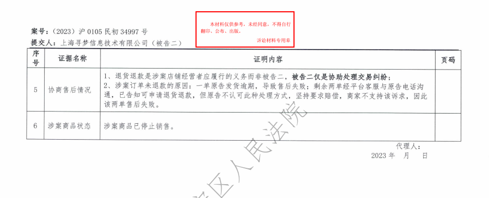 【211(三)】 《判决书》第8页,被告寻梦公司为证明其主张,向法庭提交了①订单信息、②涉案商家信息、③拼多多用户服务协议、④拼多多平台合作协议及签署记录、⑤协商售后情况、⑥涉案商品状态、⑦平台对商家直播违规的处罚截图等证据。(序号①②③④⑤⑥⑦为本文填加)表格: